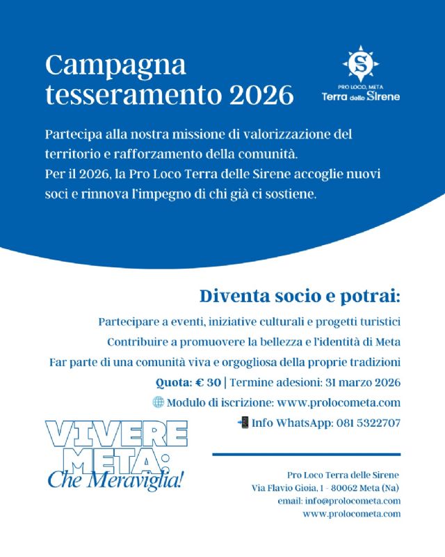 “Vivere Meta, che meraviglia!”:non è solo uno slogan, ma un impegno concreto e quotidiano che la Pro Loco Terra delle Sirene di Meta rinnova con l’avvio della campagna tesseramento 2026. Un invito rivolto a tutta la comunità a vivere la città con maggiore consapevolezza, partecipazione e orgoglio, contribuendo in prima persona alla sua valorizzazione culturale, sociale e identitaria.